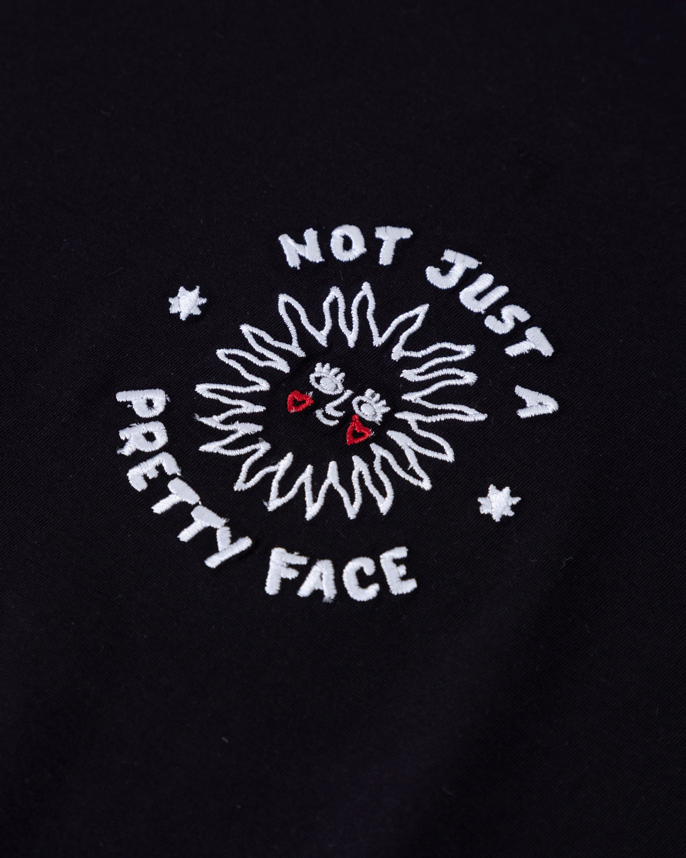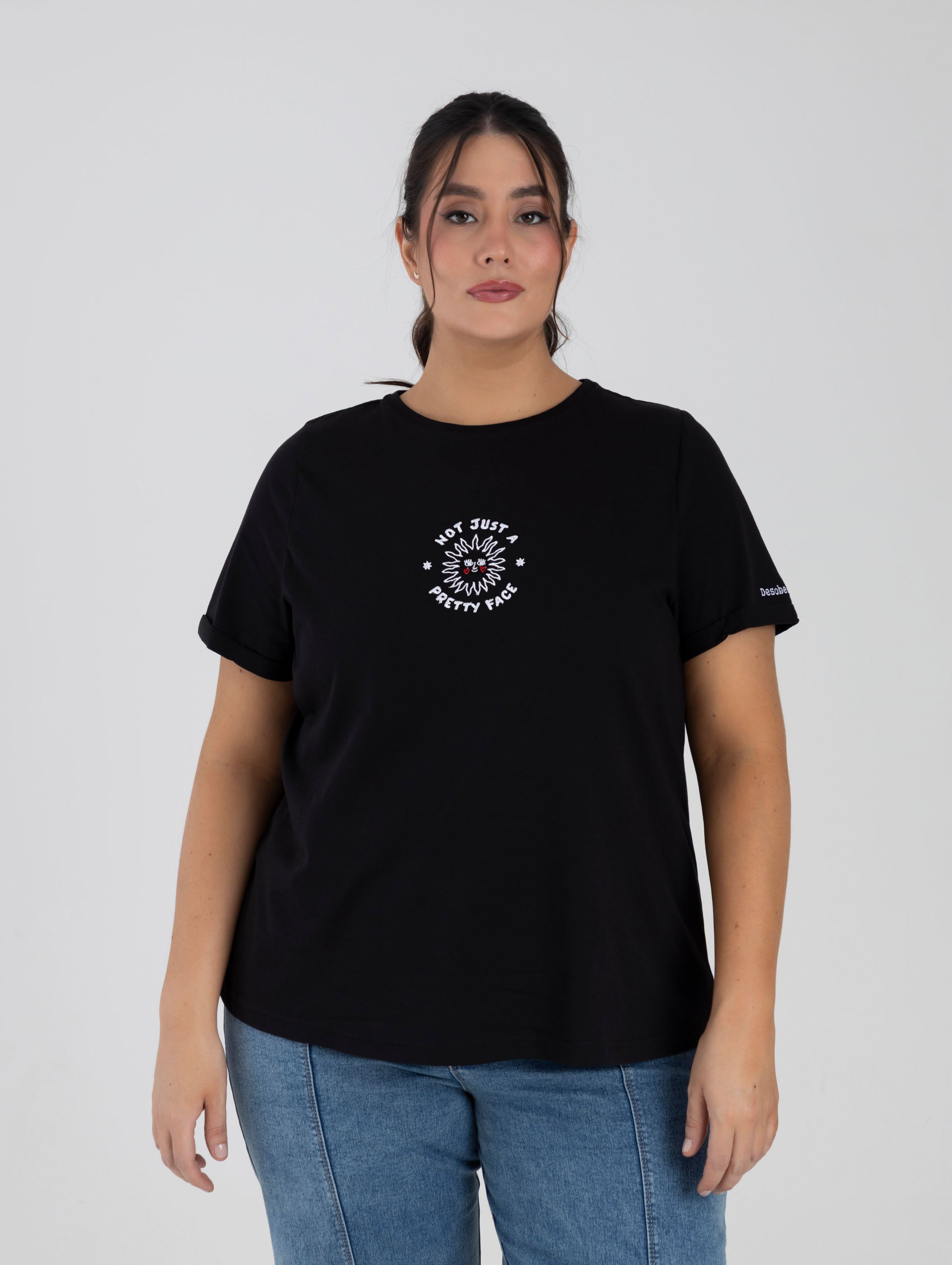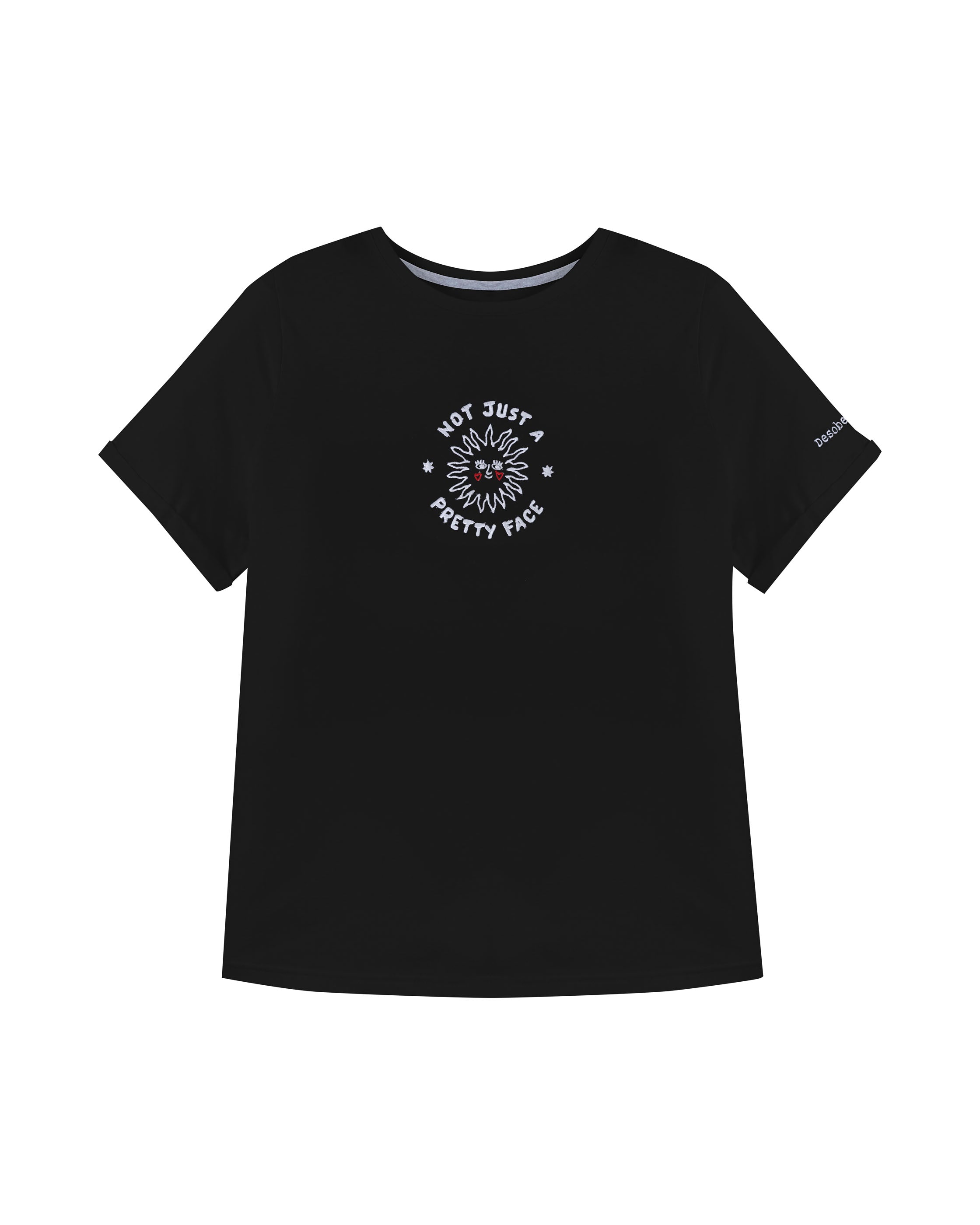La camiseta Pretty Black es una respuesta bordada a uno de los piropos más vagos que nos han dicho toda la vida: “linda de cara” Esa frase que parece halago, pero que nos dejó claro desde niñas que había una parte de nuestro cuerpo que se percibía como bonita, y otras que no.