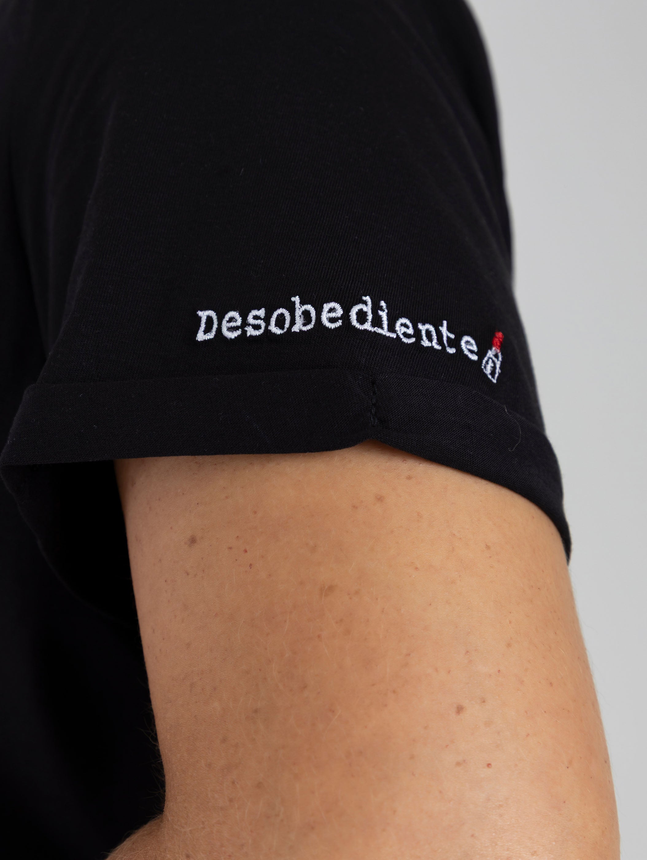 Bordado en manga “Desobediente” + labial ilustrado
