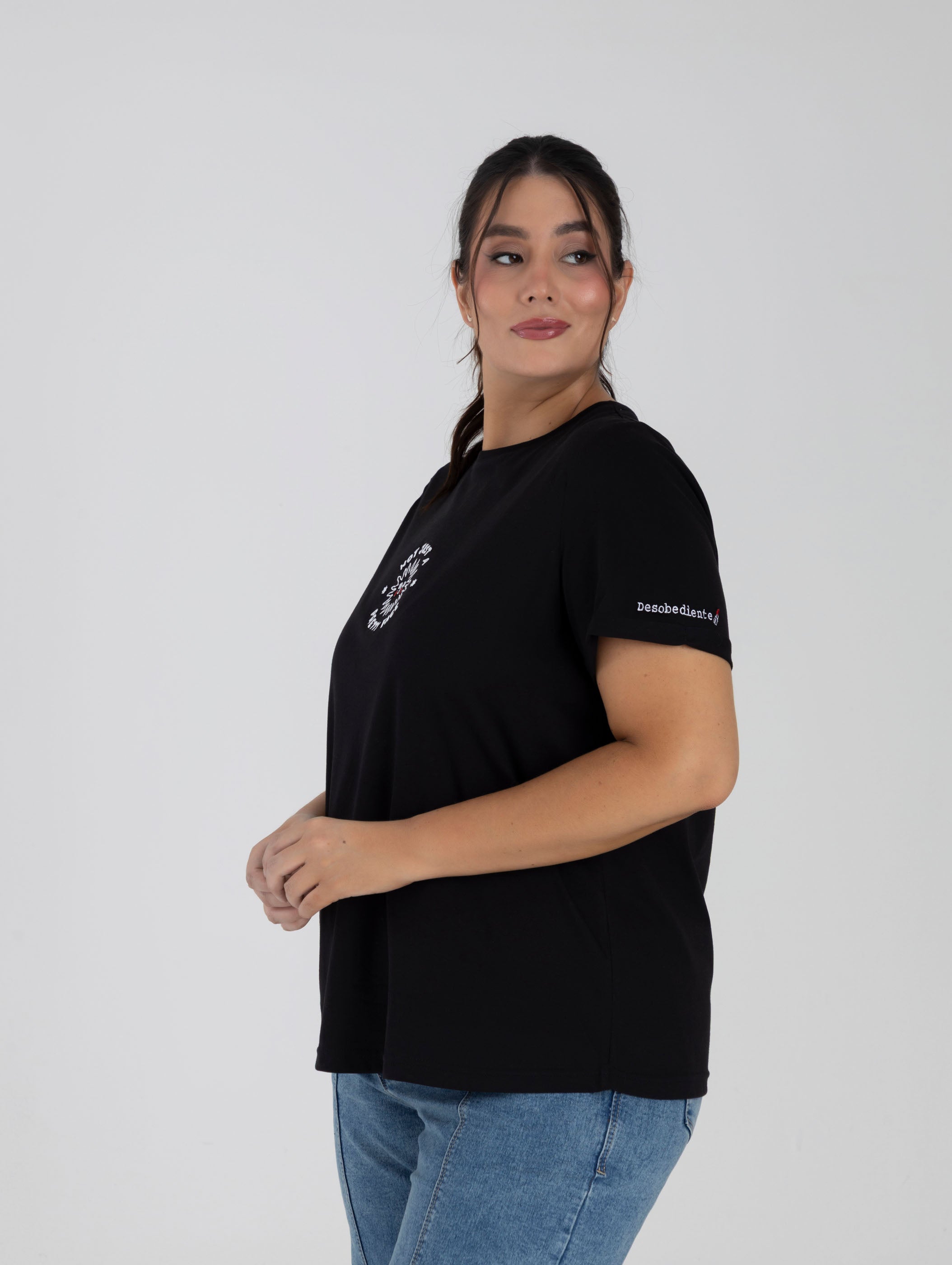 Ilustrada por @macapape, convierte ese comentario limitante en un guiño afirmativo. En la manga, el bordado dice “desobediente” junto a un labial: recordatorio de que la feminidad también puede ser rebeldía y decisión.