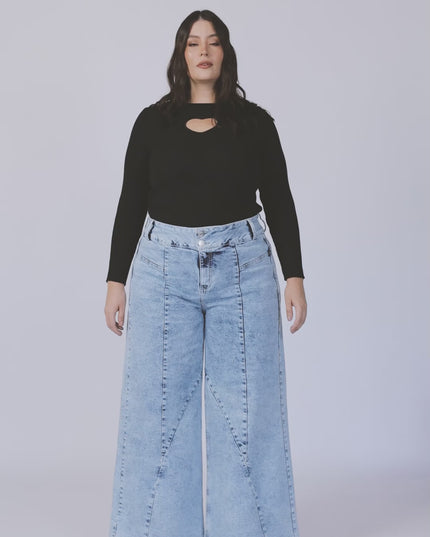 Detalles: Jean stretch light blue, wide leg, tiro alto con pretina ancha y doble botón, cortes asimétricos y bolsillo de parche trasero. Composición: 98% algodón, 2% elastano.