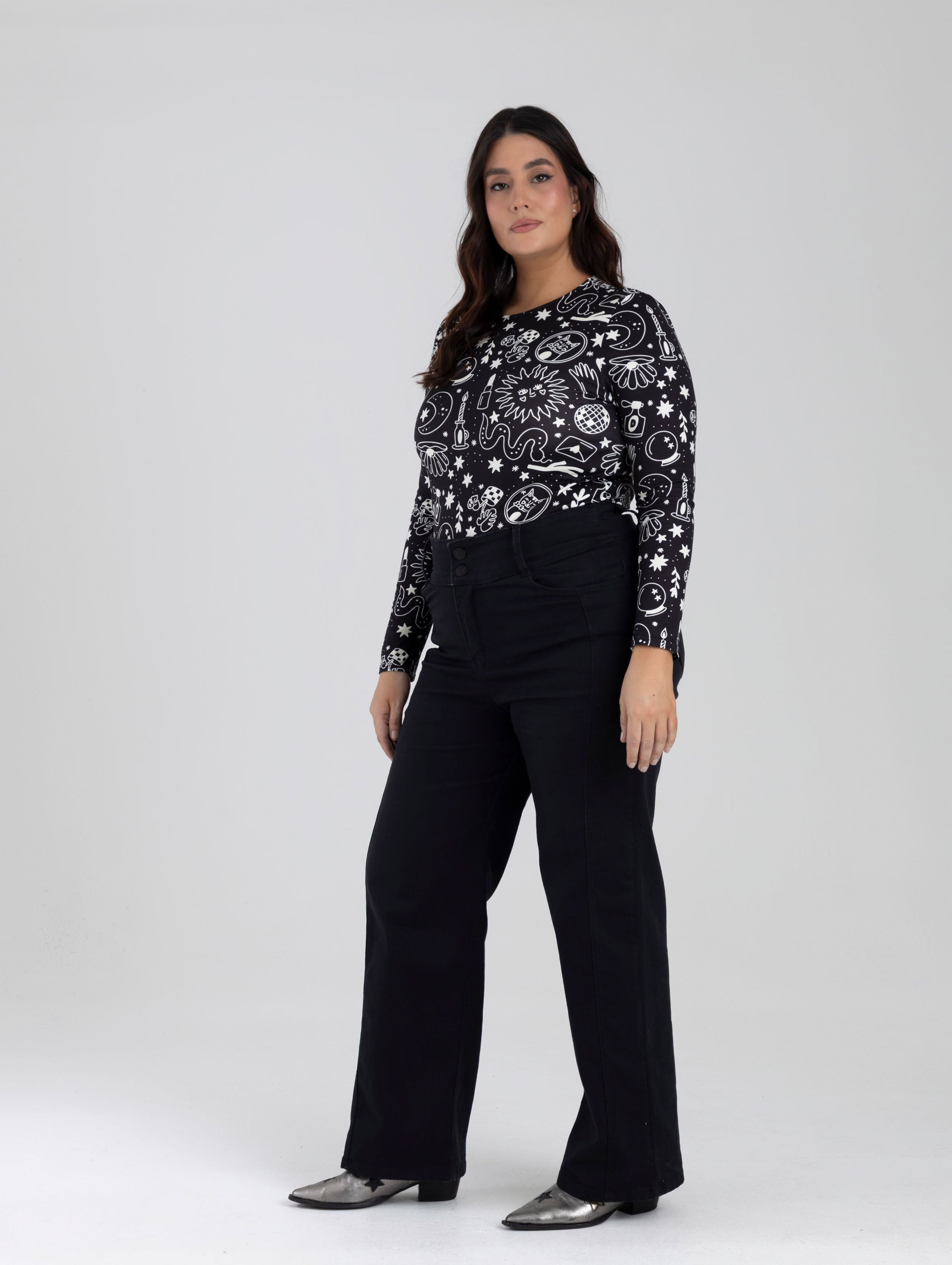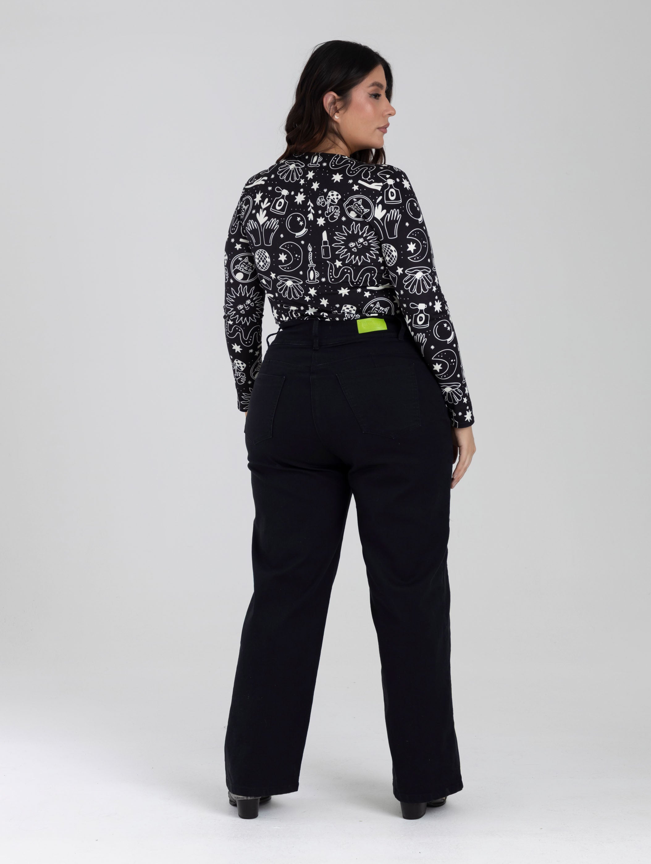 Cuenta con nuestra pretina ancha de doble botón, sello de Díscola, que da soporte sin incomodidad, y bolsillos delanteros y traseros reales (porque el diseño práctico también es parte de nuestra filosofía). Su color negro profundo y su silueta recta forman una caída limpia, logrando ese efecto que define nuestra marca: cuerpo bonito, sin moldear, sin apretar y sin pedir permiso.