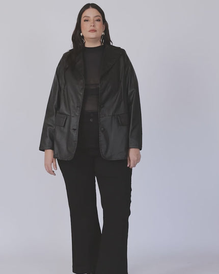 Detalles: Blazer lycrado efecto cuero color negro con Hombreras, bolsillos delanteros y botones forrados. Composición: 70% Rayón, 26% Nylon y 4% Elastano.