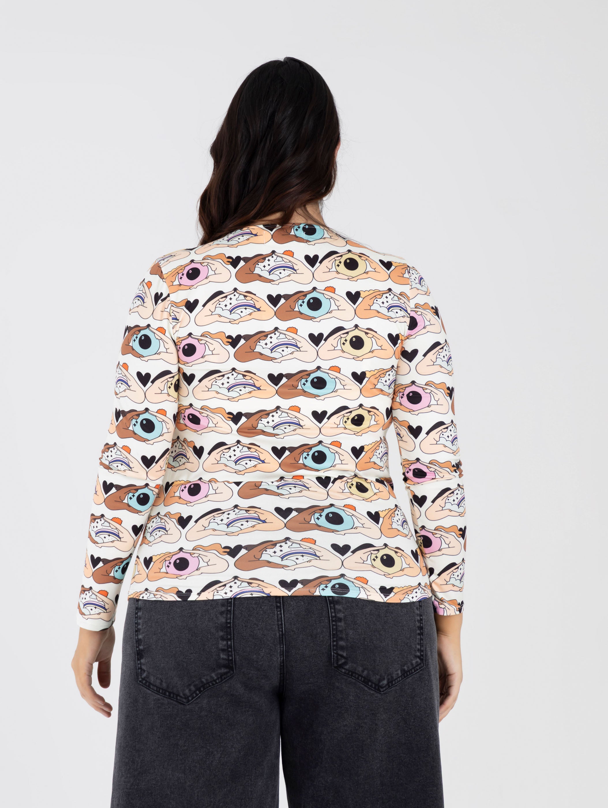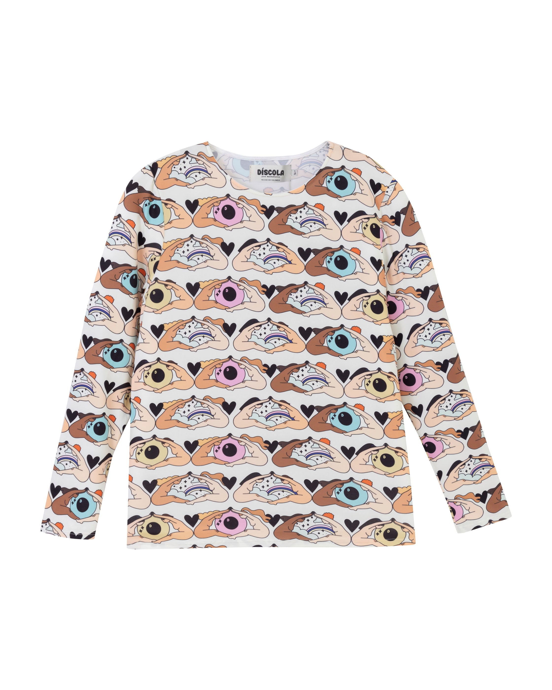Su estampado ilustrado por la artista colombiana @macapape, reúne distintos cuerpos que no buscan parecerse entre sí, pero cuando se juntan, crean algo poderoso y bello. Como las comunidades que se acompañan y se sostienen. Su silueta es cómoda, ligera y elástica, con cuello redondo y mangas largas que abrazan, no aprietan.